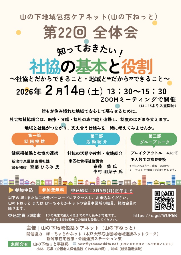 ※当会会員事業所・賛助会員へは1月11日にご案内をメールにて配信しました。また、当会会員以外の山の下、藤見・下山圏域内の事業所へは共催者(新潟市在宅医療・介護連携ステーション東)よりご案内を郵送する予定です。 |